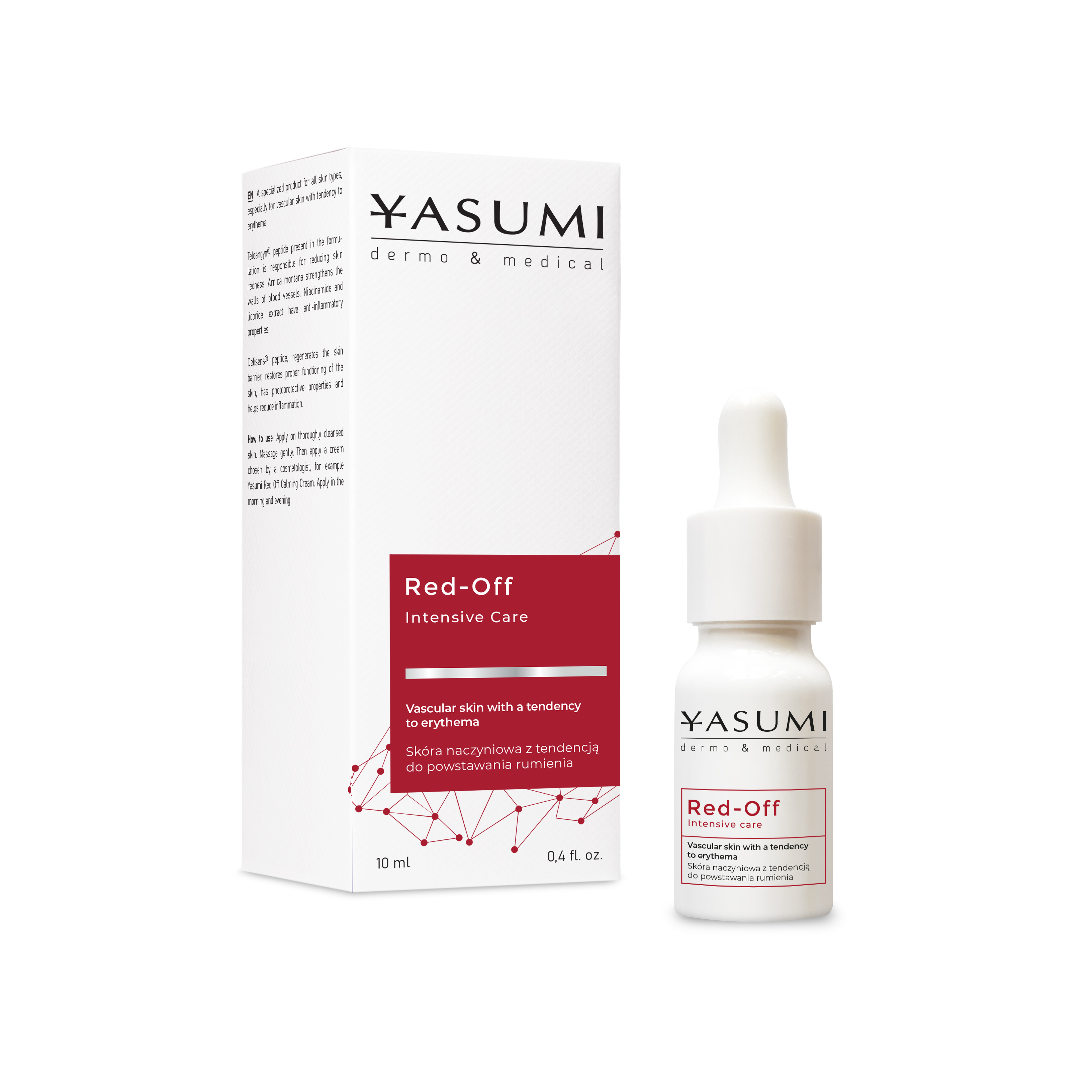 Yasumi Red off Calming Cream - łagodzący krem redukujący zaczerwienienia do codziennej pielęgnacji skóry. Zawiera unikalny tetrapeptyd Teleangyn®, który obkurcza i uszczelnia naczynia włosowate. Ponadto w składzie znajduje się także wyciąg z ruszczyka kolczastego – zmniejsza zaczerwienienia, redukuje rumień, opuchliznę i cienie pod oczami, alfa bisabolol – wycisza skórę, łagodzi podrażnienia, działa przeciwzapalnie, olej z pestek winogron – nawilża i głęboko ją odżywia. Krem ma zielony kolor, dzięki czemu kamufluje niedoskonałości cery.